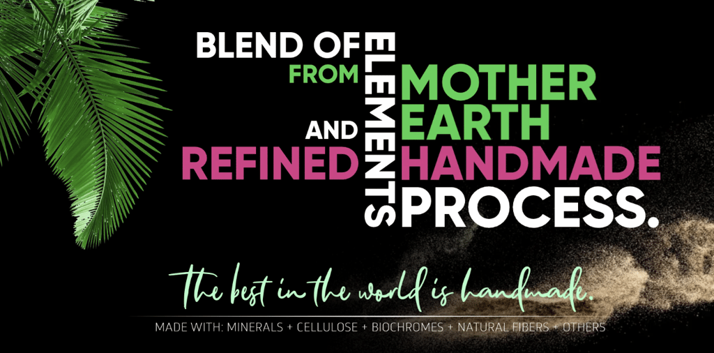CAREFULLY HAND MADE WITH MINERALS, CELLULOSE, BIOCHROMES, NATURAL FIBERS AND OTHERS.